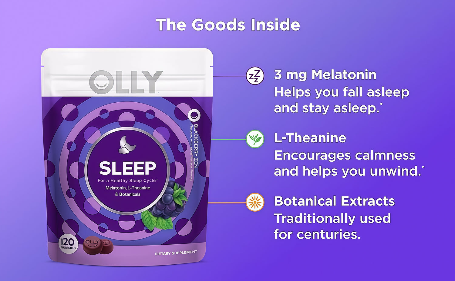 OLLY Sleep Gummies feature a blend of L-Theanine and Melatonin, working together to help ease the mind and prepare the body for rest. This combination encourages relaxation and contributes to a more consistent sleep pattern. The formula is designed for those seeking a gentle aid for nightly rest.